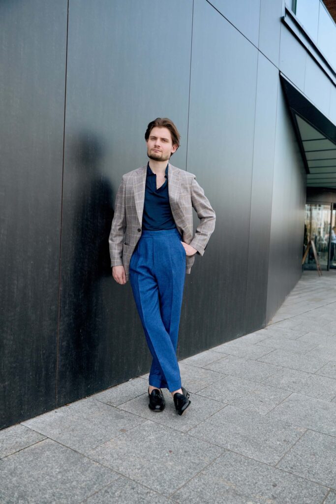 Przez słowo tkanina mam na myśli nie tylko jej skład, bowiem wełna to świetny wybór zarówno zimą jak i latem. Posiadam letnią 100% wełnianą marynarkę i również uszytą z wełnianej tkaniny marynarkę zimową. To dwa różne ubrania. Letnia jest lekka, cienka i o luźnym splocie, z kolei zimową jest znacznie cięższa, o grubym materiale. Również kolor marynarek i spodni ma znaczenie. Latem dużo lepiej wyglądaj jasne: beżowe i niebieskie ubrania, z kolei zimą celuję w ciemniejsze zestawienia. Zawsze stawiam na naturalne tkaniny, jednak w przypadku strojów letnich jest to warunek sine qua non. Właśnie te trzy elementy: naturalne składniki, luźny splot i jasne kolory sprawiają, że stylizacja letnia jest zarówno elegancka jak i komfortowa w noszeniu.
