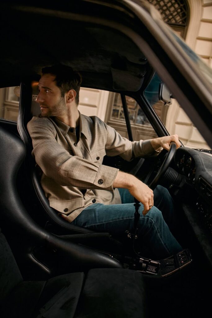 Marynarka i spodnie nie pochodzą z tego samego zestawu. Ta stylizacja to typowy zestaw koordynowany ale dzięki zbliżonym kolorom i podobnej fakturze z odległości kilku metrów wygląda jak garnitur. Patent ten bardzo mi się podoba – dzięki niemu osiągamy efekt garnituru, pozostając w stylu smart casualowym. Nie wymyśliłem go jednak sam – wyprzedził mnie Brunello Cucinelli, jednak jeśli się uczyć to od najlepszych, a Brunello to mój ulubiony projektant. W skład zestawu wchodzą spodnie i marynarka M.Ceran z cienkiej wełny, kolejna koszula print Emanuela Berga i zamszowe trzewiki z przeszyciem na nosku z limitowanej kolekcji Berwick uszytej specjalnie dla Salonu Klasyczne Buty. Buty dla odmiany są na skórzanej podeszwie ale sklep w ramach zakupu oferował bezpłatne zelowanie wysokiej jakości kauczukową nakładką Dunlop. Skorzystałem z tej możliwości, ponieważ chodzę w tych butach także jesienią. Skąd pomysł na takie zestawienie? Ponownie podpatrzony tym razem od Króla Luzu (King of Cool) Steva McQueena , który często nosił zamszowe trzewiki latem i Daniela Craiga, którego możemy uznać za następcę legendarnego Amerykanina. Całość uzupełniłem brązowym krawatem z grenadyny marki Klasyczne Buty, który nawiązuje do koloru obuwia i podkreśla niezobowiązującą elegancję całości stylizacji.